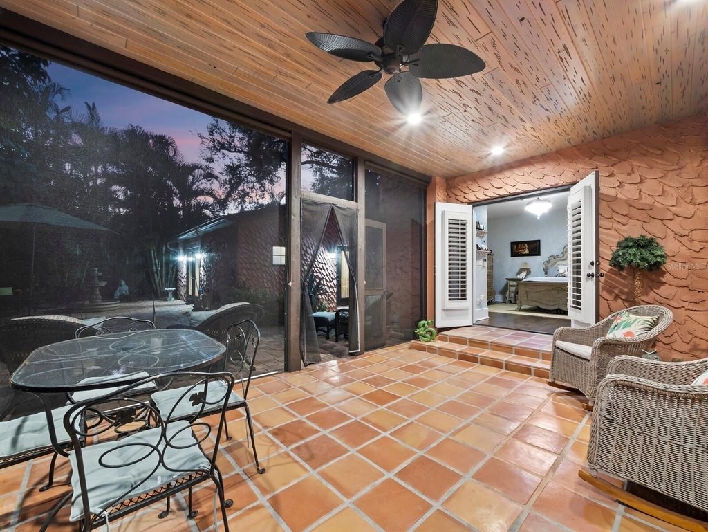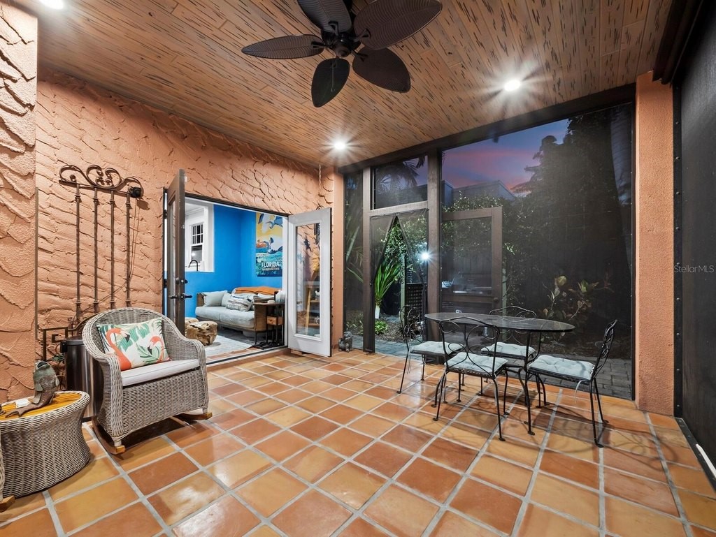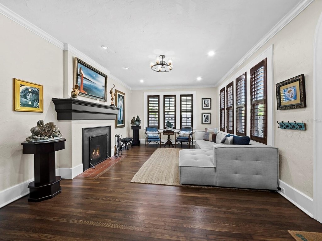 Situated in the highly desirable West of Trail neighborhood of Hudson Bayou, this fully restored 1922 residence is the perfect blend of historic charm and modern conveniences. The property offers 2, 284 square feet with two bedrooms and two bathrooms in the main house, plus a one-bedroom, one-bathroom guest house. Renovations include a 2006 conversion of the garage into a guest house with a stucco privacy wall and Chicago brick driveway. In 2018, a spacious primary suite with double closets, a large bath, and French doors to a screened lanai was added. High ceilings, oversized impact windows, and refinished hardwood floors (2024) add to the homes appeal. Recent updates include a recoated roof with a 10-year transferable warranty (2025), A/C (2023), water heater (2024), encapsulated crawlspace with dehumidifier (2024), foundation reinforcement with new support jacks (2024/2025), and hurricane-rated windows. The kitchen and dining area were fully renovated, featuring custom Calistoga cabinetry and designer appliances (2024/2025). Additional features include recessed lighting, custom closets, a Murphy bed, and a natural gas fireplace. A wellness room with an infrared sauna (2025) completes the interior. Exterior highlights include enhanced landscaping, three all-weather sheds, a pergola with natural gas grill hookups, and a serene brick courtyard surrounded by mature landscaping for privacy. The location is unparalleled, with proximity to Southside Village, the downtown Sarasota bayfront, St. Armands Circle, and the world-famous beaches of Lido and Siesta Key.